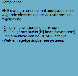 - milieuvergunningen, environmental due diligence audits en implementatie van REACH.